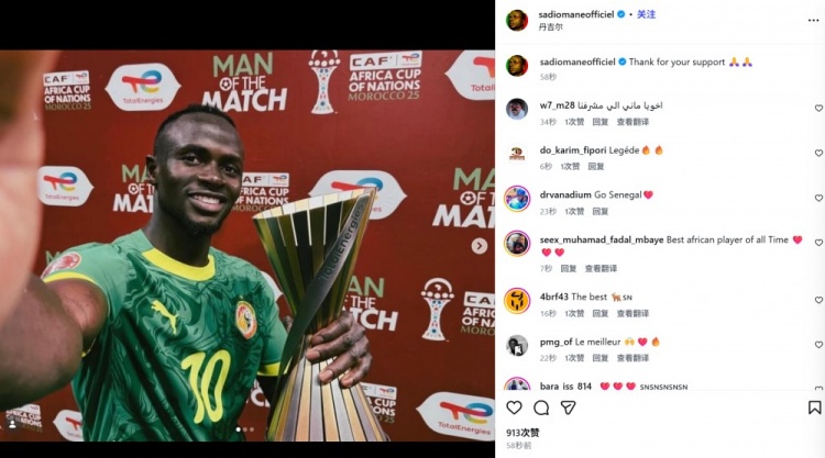 马内也在赛后通过社媒晒出自己和MVP奖杯的自拍照,并配文:“感谢大家的支持。”塞内加尔将在决赛挑战东道主摩洛哥。